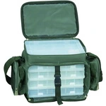 Centraal compartiment voorzien van 5 transparante tackleboxen en dubbele ritssluiting
